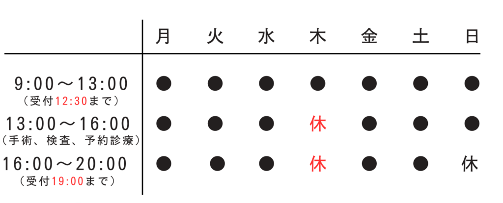 :木曜は午後休診、日曜・祝日は17:00まで(受付16:00まで)